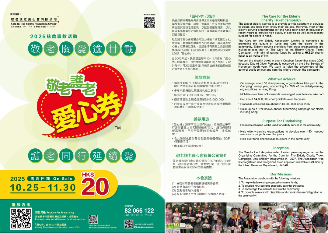 2002年開始,敬老護老愛心會有限公司已舉辦「敬老護老愛心券」慈善籌款運動,將籌募所得之所有收益,分配給予所有參與「敬老護老愛心券」慈善籌款運動的社會服務機構/單位,讓它們籌得所需資源,用於所需要的長者服務,造福長者。 「敬老護老愛心券」慈善籌款運動主要是以發售慈善券的形式,向社會各界人士義賣每張定價港幣二十元的「愛心券」,經過多年的運作,已經穩步成長。每年超過50多間長者服務機構參加「敬老護老愛心券」慈善籌款運動,總計佔全港長者服務機構的七成,惠澤數以十萬計的長者。